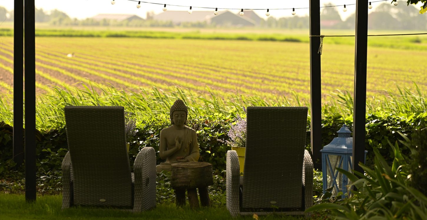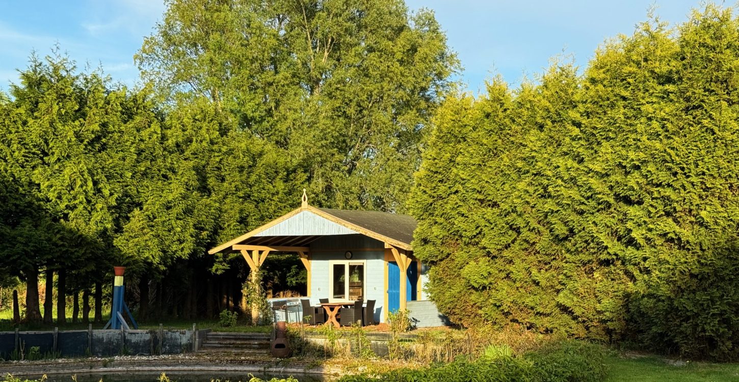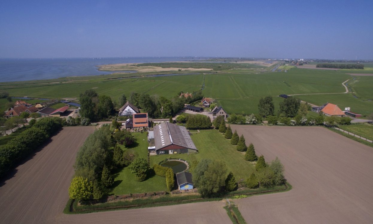 Samen met de woonboerderij liggen de vakantiehuisjes op het 1 ha groot landgoed. Zowel aan de voorzijde als aan de tuinzijde liggen meerdere terrassen waarvan u gebruik kunt maken. De terrassen zijn voorzien van tuinmeubilair en u kunt hier de ruimte ervaren van het weidse Friese land.  Súdwest-Fryslân